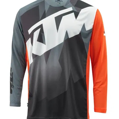 Durable offroad shirt Finely ventilated PE fabric UV-resistant and fade-proof sublimation prints 100% Polyester KTM Collection: Pounce KTM Playground: Dirt Racer Gender: Men Terrain: Offroad Color: Gray, Orange